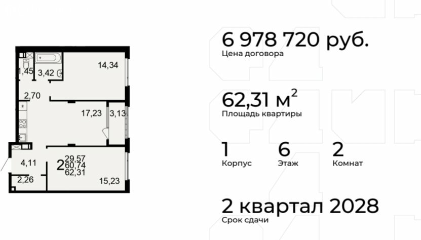Общая площадь — 62,31кв. м, из которых 29,57 м2, составляет жилая площадь, а просторная кухня занимает 17,23 м2.